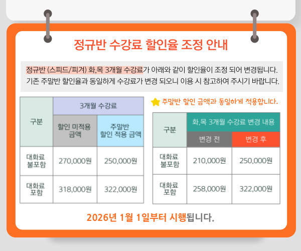 정규반 화목 3개월 수강료가 아래와 같이 변경 될 예정입니다.