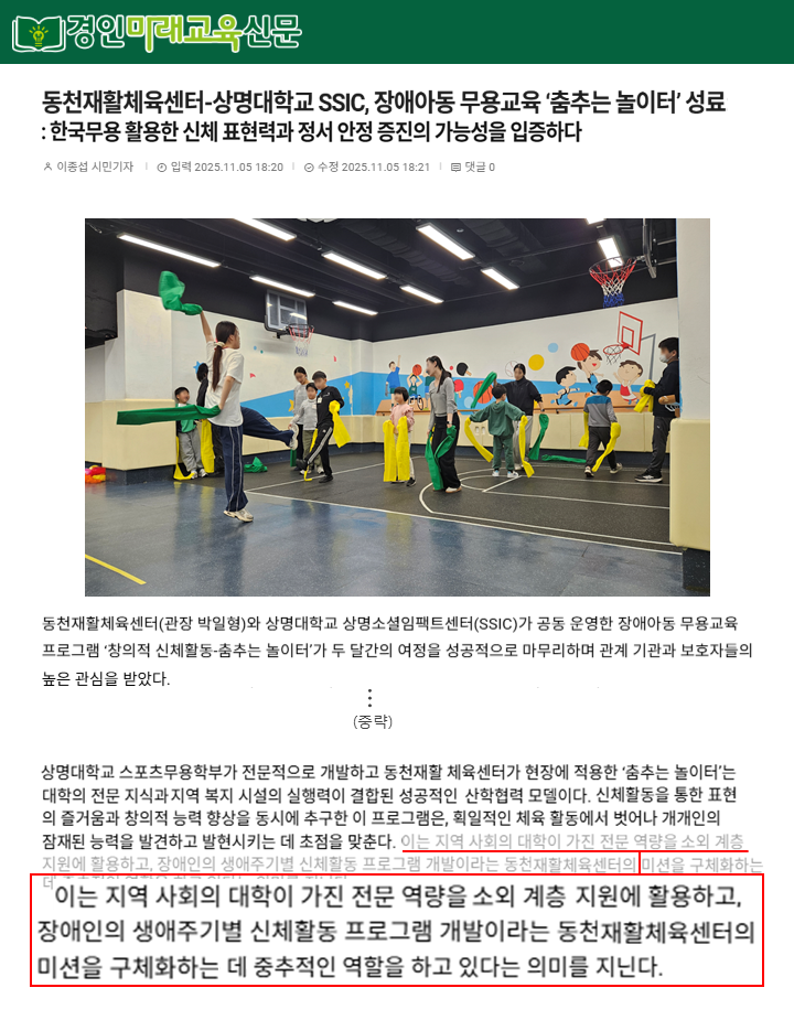 지난 11월 3일에 종료된 동천재활체육센터-상명대학교 SSIC의 창의적 신체활동 ‘춤추는 놀이터’ 프로그램에 대한 보도자료가 ‘경인미래교육신문’에 게재되었습니다. 이후, 더 알찬 프로그램으로 돌아올 수 있도록 동천재활체육센터에 많은 관심 부탁드립니다.